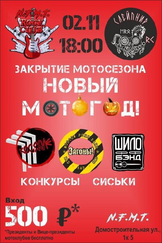 Москва, похулиганим?;) 02 ноября мотоклуб Слейпнир RC приглашает всех в МузПаб NeForMaT на НОВЫЙ МОТОГОД!🤘🏍️ Провожаем уходящий сезон в компании отличных музыкантов: ⁃ ЗАГОНЫ ⁃ КОСЯКИ ⁃ и МЫ! Так же вас ждут: Увлекательные конкурсы 🎁 Эксклюзивная шоу-программа 💃 Большое разнообразие вкусного на баре 🍻🍹 Место проведения: МузПаб NeForMaT Дата: 02.11.2025г. Двери: 18:00 Стоимость входа: 500₽ 18+