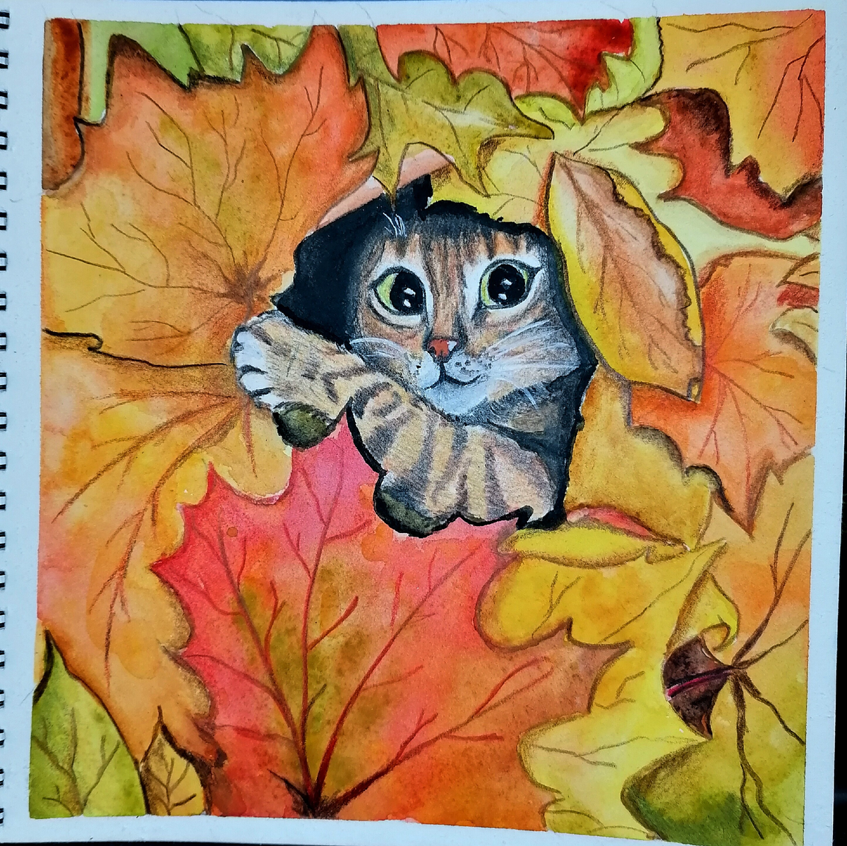 Котик в листьях.