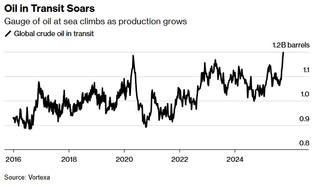 Добыча нефти основными производителями по всему миру наращивается Объемы перевозок нефти по морским путям на танкерных судах снова увеличились, так как ведущие производители нефти по всему миру наращивают объемы добычи. По данным Vortexa, общий объем транспортируемой нефти достиг 1,2 миллиарда баррелей, что является самым высоким показателем как минимум с 2016 года. Если учесть суда, которые перевозят нефть, но не находятся в движении, этот показатель станет максимальным с 2020 года, когда пандемия COVID-19 снизила спрос, и трейдеры начали хранить баррели на различных типах судов — от огромных супертанкеров до маленьких барж. Уровень добычи нефти в море растет. Источник: Vortexa Прогнозы указывают на продолжение роста мировых поставок нефти в четвертом квартале текущего года и в начале 2026 года. Это связано с увеличением добычи как внутри Организации стран-экспортеров нефти (ОПЕК), так и за ее пределами. Большинство рыночных аналитиков ожидают, что рост предложения будет превышать рос