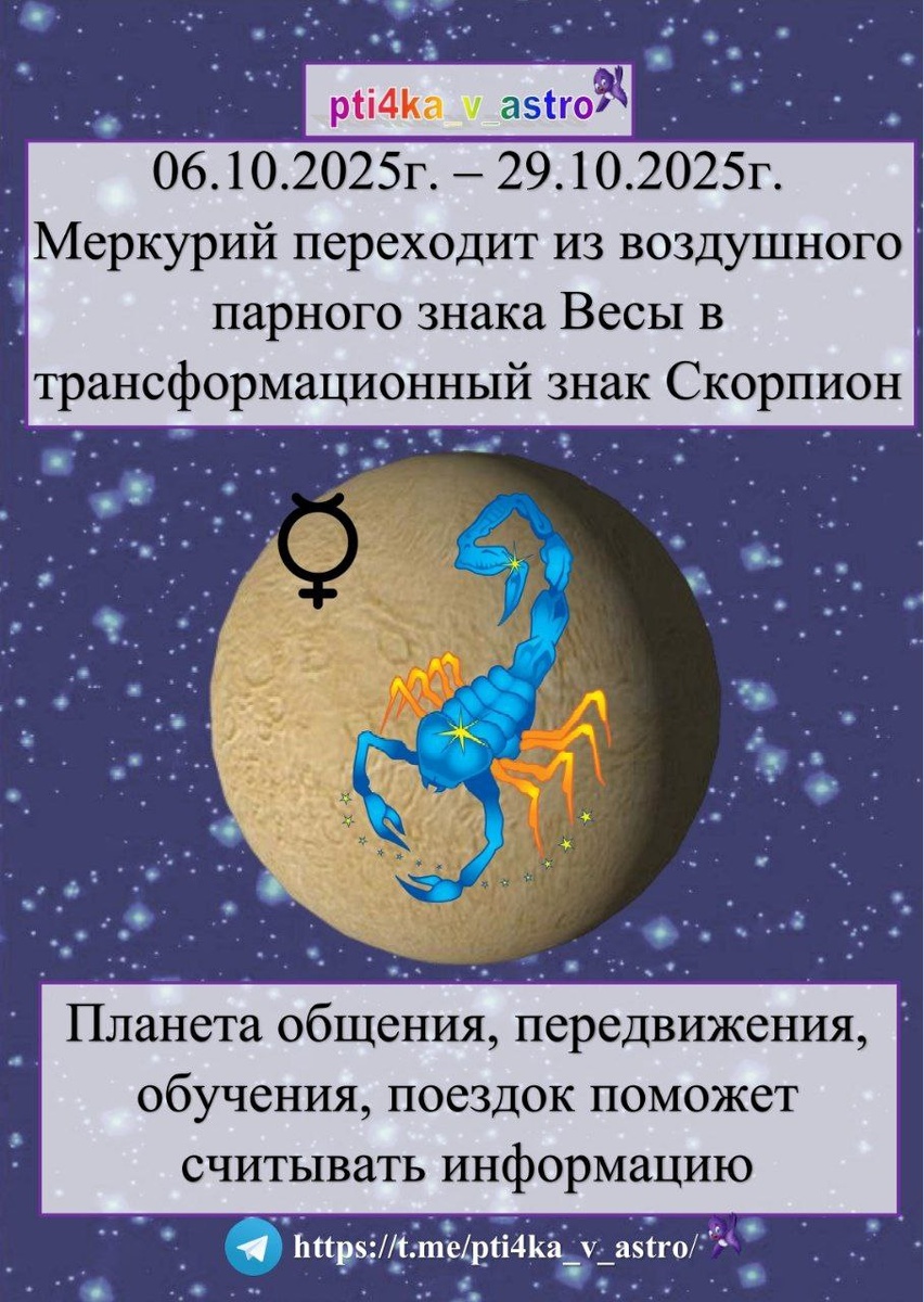 🪡 "Колкость в деле" 📁 ☿ Меркурий в знаке Скорпион ♏ с 19:40:35 мск 06.10.2025г. по 14:01:52 мск 29.10.2025г. ☿ Меркурий - планета общения и коммуникаций, обучения и поездок ♏ Скорпион - знак проницательности, мистики и трансформации ☿ В это время будут вскрываться тайны, произойдут глубокие трансформации и исцеления 🐦🔥 📋 В деловых переговорах будет легко докопаться до сути, истины 📚 Сможете изучить большое количество информации ‼️ Держите себя в руках Не говорите и не действуйте на эмоциях, если не готовы разорвать отношения с оппонентом - не важно кто он или она, муж/жена или работодатель/ партнер 🪶Всем лёгкого прохождения этого времени! #астрология #планеты #покупки #советы