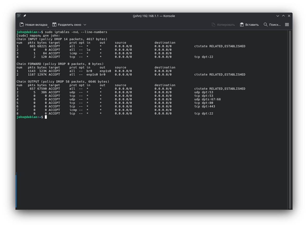Для начала посмотрим текущие правила у нас используются, для этого выполним следующую команду