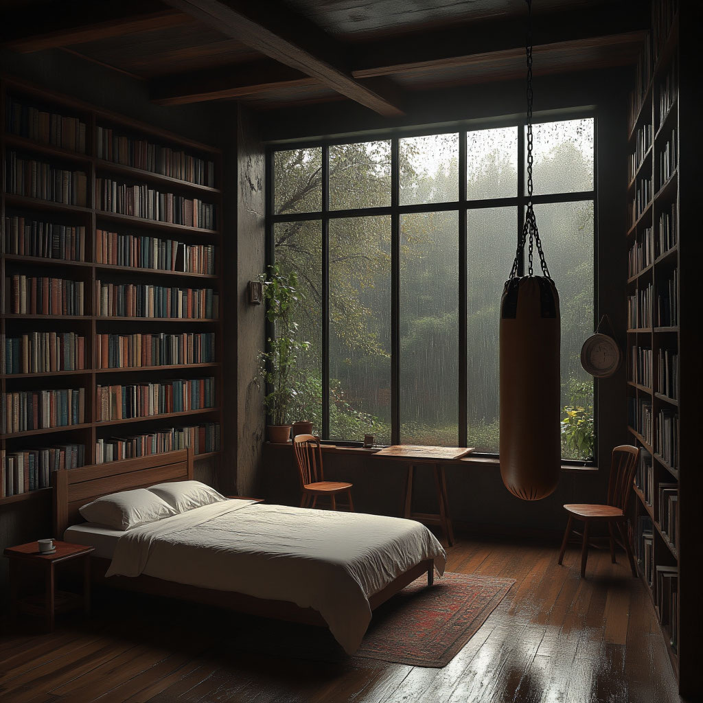 Обстановка была спартанской, но не аскетичной. Одну стену занимали книжные полки от пола до потолка, набитые книгами по психологии, философии и, похоже, русской классикой. В одном углу аккуратно стояла простая кровать. В другом — небольшой столик с двумя стульями. Но самым поразительным предметом была тяжёлая боксёрская груша, свисающая с укреплённой балки в центре комнаты, — осязаемое свидетельство его другой жизни. В воздухе пахло старыми книгами, чистым бельём и едва уловимо — кожей.
