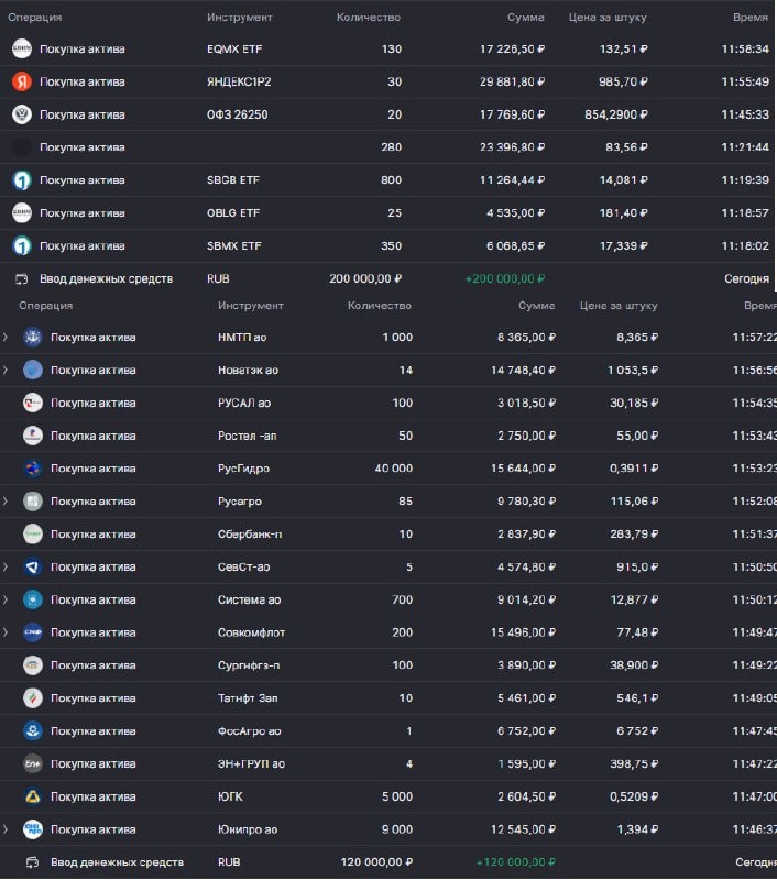 Привет всем! 👋 Пока я был в отпуске, фондовый рынок решил немного "приуныть" 😅 Индекс МосБиржи скатился почти на 2600 пунктов! Для меня это отличная новость, ведь появилась прекрасная возможность закупиться подешевевшими активами! 🚀 Сегодня закинул в общей сложности 320 000 рублей: * 200 000 рублей пополнил на ИИС, чтобы получить налоговый вычет. * 120 000 рублей отправил на брокерский счет. Покупки совершал, строго придерживаясь своей стратегии: * Купил доллары. 💰 * Поучаствовал в первичном размещении замещающих облигаций. * Докупил ETF на акции и облигации. * А также добрал акции тех компаний, чья доля в портфеле снизилась. В общем, продолжаю двигаться по намеченному плану и радуюсь каждой возможности купить активы со скидкой! 💪 Время возможностей! #инвестиции #фондовыйрынок #акции #облигации #ИИС #стратегия #мосбиржа