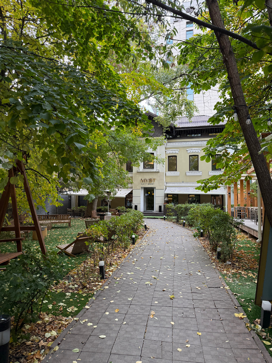 На Белорусской оказывается есть такой невероятно уютный зеленый (ну скоро будет оранжево желтый, а потом и снежный) дворик, с двухэтажным особнячком как из каких-то сказок! Атмосфера совершенно не центра Москвы. Перешагиваешь за небольшую кованую ограду и буквально оказываешься в другом мире! Ресторан Myst. Внутри ресторан с кухней в стиле «комфорт фуд», бар с авторскими коктейлями, и есть даже пространство для вечеринок! Интерьер современный, наверное, даже фьюжн. Глянцевые поверхности, цветное стекло, дерево, посадка как на мягких креслах и диванчиках, так и на стульях в эко стиле. Много свечей, с красивыми восковыми подтеками, милые гипсовые фигурки купидончиков, зеркала в золочениях рамах. Такая много детальность, но не перегруженная, интересно разглядывать. Комфорт-фуд это про еду, которую мы любим, без особой привязке к кухне. Тут просто собраны позиции, которые популярны у гостей и дают хорошую обратную связь. Такой обед/ужин без лишнего повода, просто когда захотелось