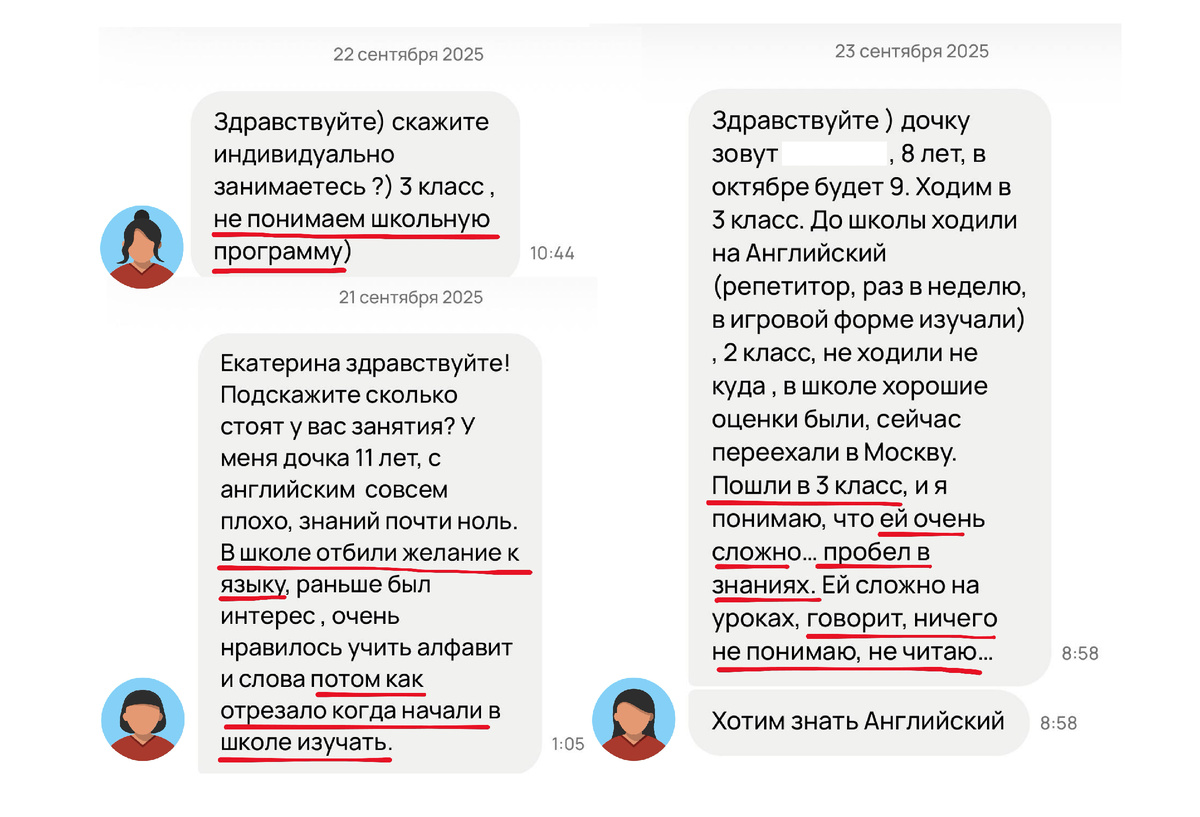 Почему нельзя просто пойти в школу и начать учить английский в школе? Потому что, к сожалению, школьная программа построена таким образом, что идёт слишком быстрым темпом. Ребёнок не успевает как следует освоить материал, знания накладываются друг на друга и превращаются в «кашу» в голове. В итоге - отсутствие интереса и мотивации: «всё равно ничего не понятно».