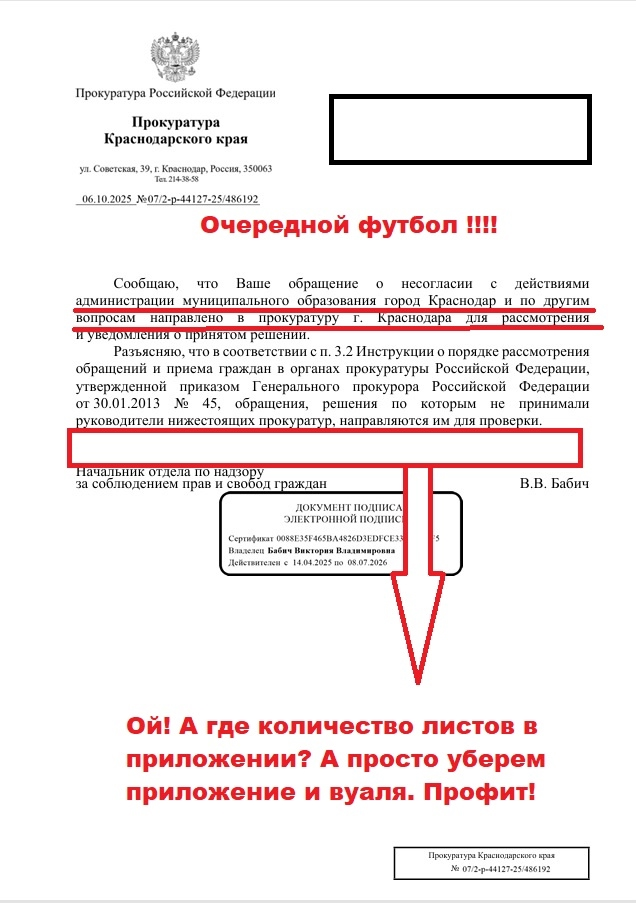 Мои многочисленные обращения в прокуратуру г. Краснодара (Малышев Д.С.) и прокуратуру края (Бабич В.В.) не привели к реальному реагированию, а лишь перенаправлялись по кругу.