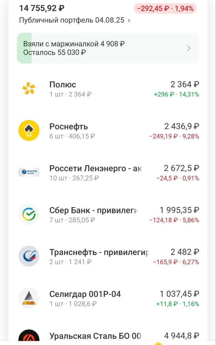 Черепахо инвестиции снова в деле! 🙏 Нет нет, я не забыл, и я продолжаю челлендж. "Старые параметры" Стартовый капитал 10 000 Ежемесячные пополнения 5000 Маржиналка включена до 5000р Цель: Выработка дисциплины инвестиций, формирование капитала на пенсию 🎯 Важные изменения! В этом месяце пополнился на 10 000 Для равномерности вкладывать буду по 2500 в неделю. Баланс акции облигации фонды и другое: 60/30/10 К этому стремимся, но детальную балансировку буду делать когда 100 000 + получится на балансе. Сейчас в этом портфеле 1. Сбербанк - Банк топ 1 в РФ. Технологически развит и платит дивы. (Привилегированные) 2. Полюс - Крупный золотодобытчик, золото в тренде и это хорошо) Кстати, удерживает наш портфель 3.Роснефть - это конечно топовый гос нефтедобычик. Но текщий рынок давит на всех, сильно и в том числе на Роснефть. Однако, снижать его долю - не планирую 4. Россети Ленэнерго - привилеги - распределяет риски. Энергия ⚡ защитный актив в портфеле! 5. Транснефть - Нефтетруб
