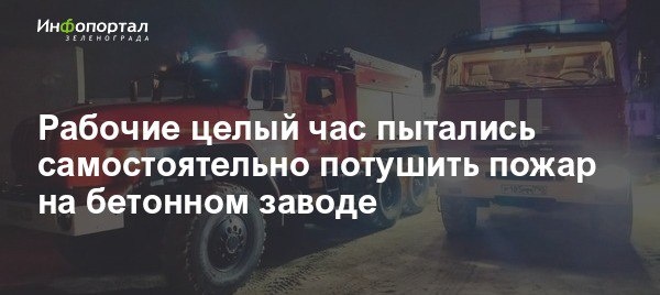 Появились новые подробности субботнего пожара на бетонном заводе у «Зеленопарка», из-за которого в Зеленограде той ночью чувствовался едкий запах. Оказывается, рабочие целый час пытались потушить пожар самостоятельно и вызвали пожарных, когда огонь стал угрожать уничтожить весь ангар. В итоге огнеборцы локализовали пожар на площади 200 кв. метров. Больше подробностей и кадров с места происшествия — в публикации Инфопортала. подписаться / обсудить в чате