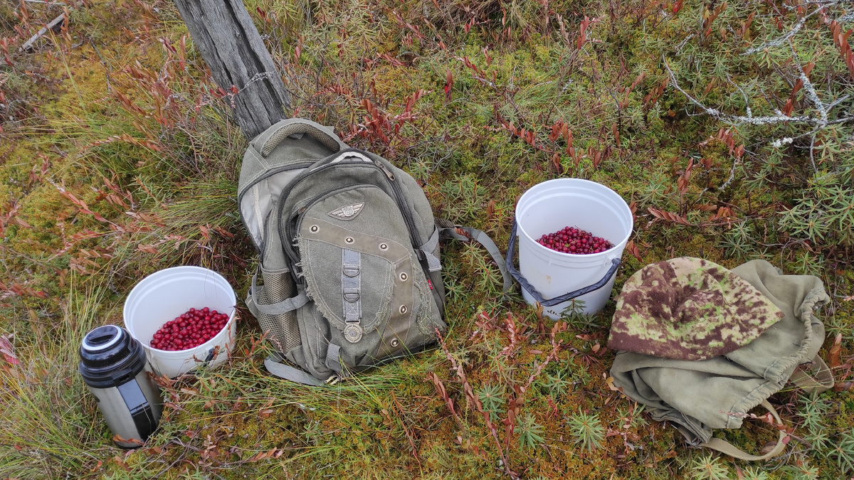 На болото мы вышли прямо к нашему месту, я за столько лет уже хорошо ориентируюсь, на соснах висят поистрепавшиеся подвязочки прошлых клюквенных сезонов. Обновила их, мама Галя дала новые голубенькие. Разложив наш походный лагерь, мы приступаем к сбору ягод.