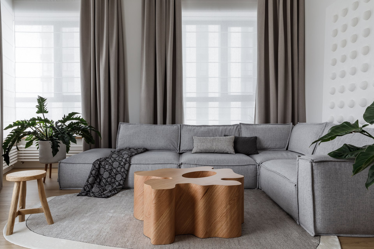 Центром гостиной стал модульный диван Этен от divan.ru. На нем большая семья любит собираться за интересным кино. Достоинство модели в том, что модули можно переставлять: менять местами и даже разносить по всей квартире.