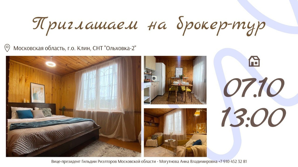 Дорогие друзья, добрый день! Приглашаем риэлторов принять участие! 🔥 Завтра в 13:00 у нас состоится Брокер-Тур уютного домика, который находится недалеко от города Клин в СНТ "Ольховка-2" 🔥 Программа: - Знакомство с объектом. - Общение, обсуждение рынка и портрета покупателя. - Подписание гарантийных писем, 💰 3% за покупателя ВАШИ. - Полезные деловые знакомства и угощения. - Фото и видеоматериалы для вашей работы с покупателями. - Розыгрыш путевки в Турцию за точный прогноз цены продажи. Начальная цена: 1.900.000 рублей Показы только 23 четверг и 25 суббота октября 2025 года Объект будет продан по цене наилучшего предложения не позднее 27 октября 2025 года Выход в рекламу запланирован на 9 октября 2025 года (в данный момент объект не рекламируется) Навигатор 👉 Московская область, городской округ Клин, СНТ "Ольховка-2", 85 https://yandex.ru/maps/-/CLBie4i4 С уважением, Анна Могутнова +7-910-452-32-81