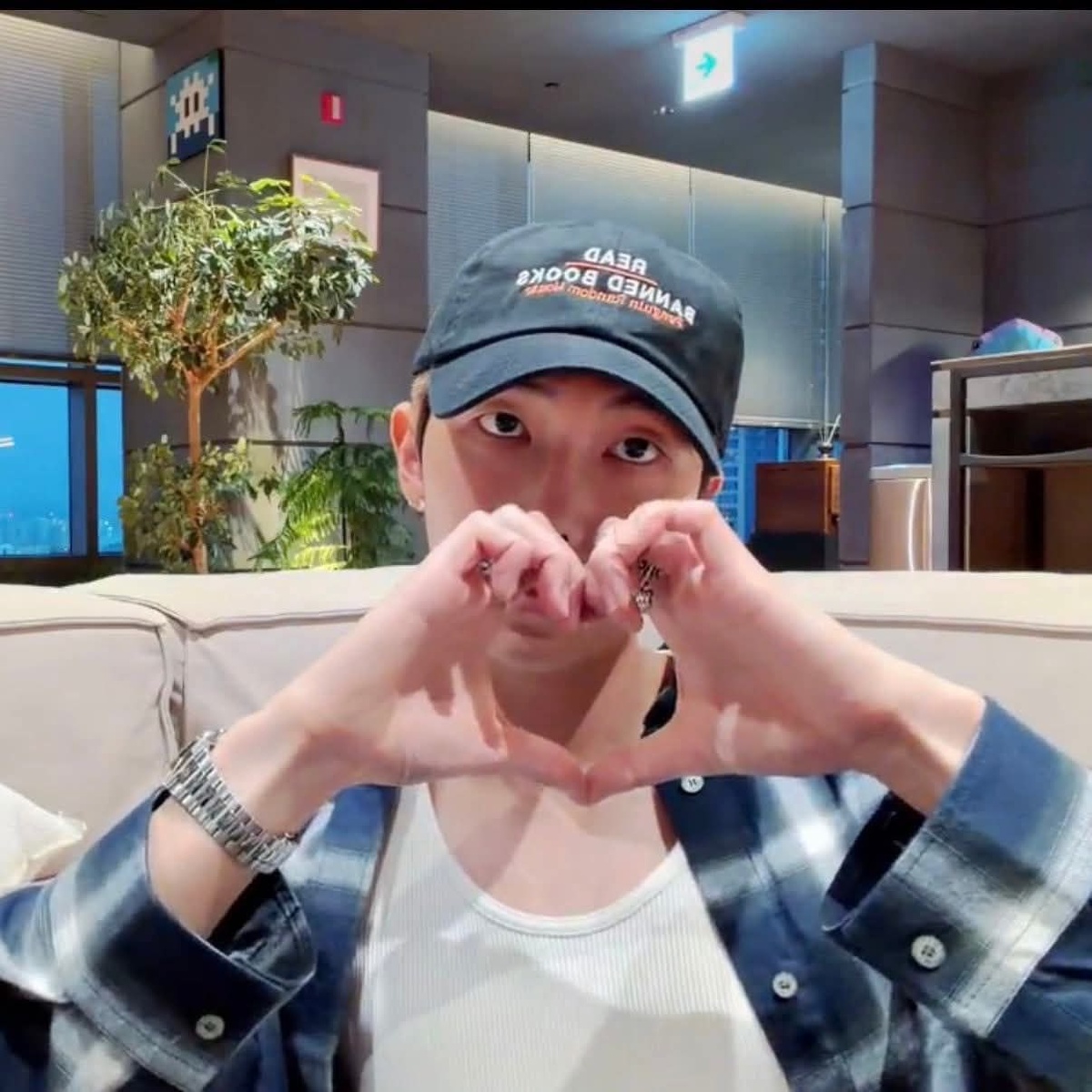 🍊 Во время прямой трансляции Намджун был в кепке надписью "Читайте запрещённые книги" от издательства Penguin Random House.
