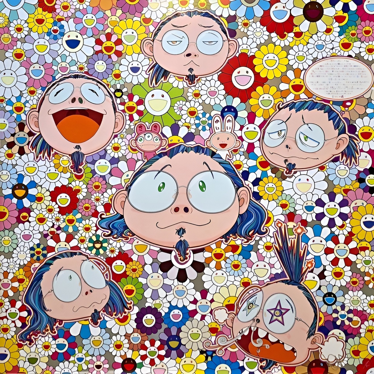 Именно в этот период появился его фирменный персонаж — мистер ДОБ, забавное мультяшное существо, вдохновлённое эстетикой манги и поп-культуры. Мураками часто изображал его на фоне, выполненном в технике нихонга, соединяя традиционные методы с элементами современного дизайна.