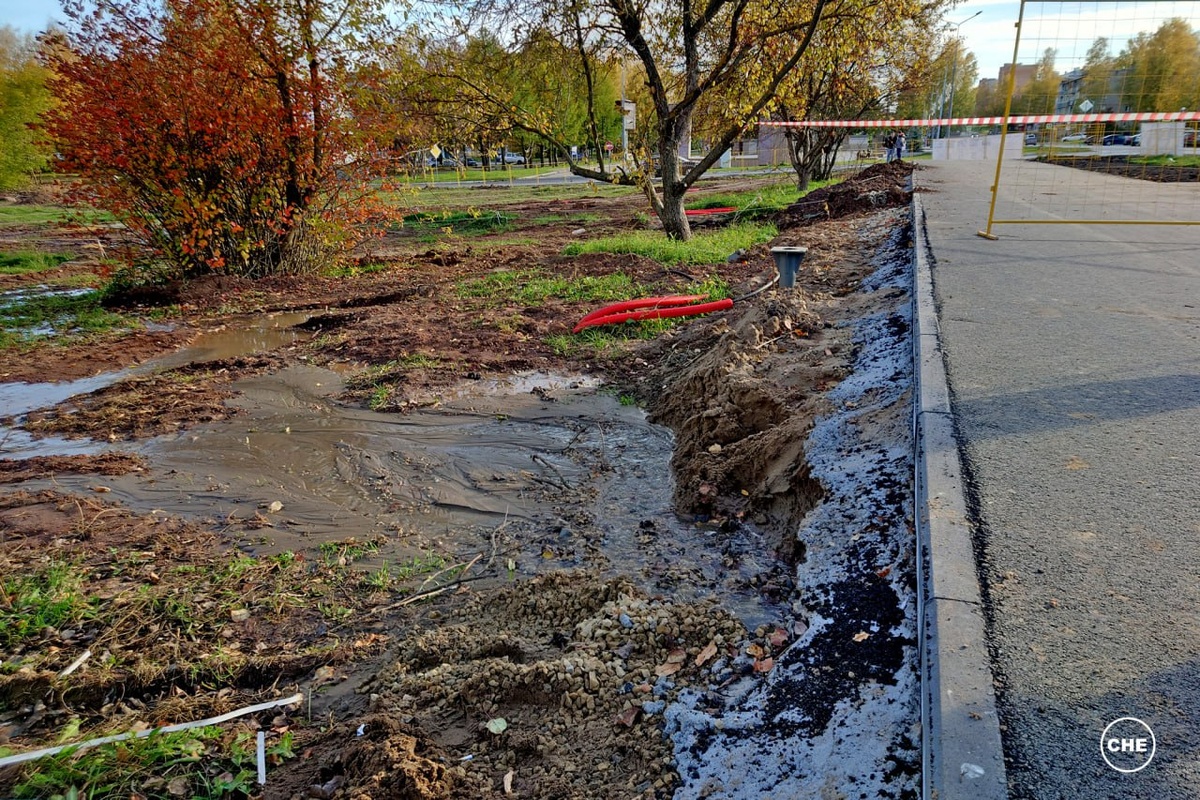 «Ключ» с неприятным запахом бьёт из-под новой асфальтовой дорожки и заливает рельеф, где проходят земляные работы. Для устранения дефекта потребуется разрушить десяток-другой метров нового тротуара. И это — дополнительные расходы и время.