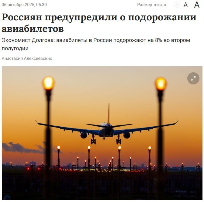 Экономисты предупреждают, что в ближайшие месяцы стоимость авиабилетов в России увеличится примерно на 8%. Это связано с подорожанием топлива, увеличением затрат на ремонт и введением нового сбора с каждого билета на ремонт аэропортов.