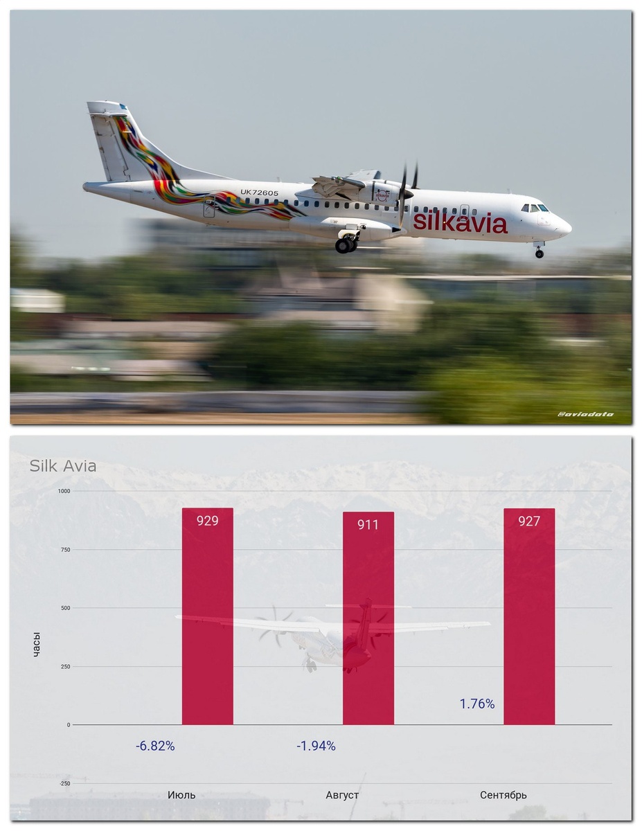 Итоги сентября: Silk Avia В сентябре общий налёт изменился незначительно. Спустя 2 месяца вернулся к полётам UK72602 и UK41001, который простоял с января. Самолёты продолжают проходить техническое обслуживание, так на обслуживание теперь ушли UK72601 и UK41002, UK72603 простаивает с марта. Среднесуточный налёт на одно воздушное судно увеличился ⬆️ на 5.15% и составил 3.26 часа. Суммарное количество часов налёта воздушных судов авиакомпании Silk Avia за сентябрь увеличилось 🔼 на 1.76% по сравнению с августом и составило 927 часов. Общая динамика за последние 3 месяца представлена на графике. #статистика #silkavia #сентябрь2025