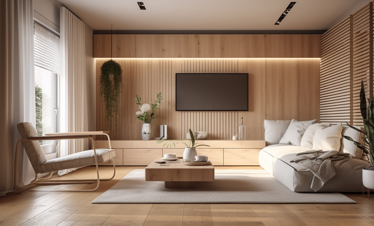 - Гостиная / зона отдыха — плавающий пробковый пол в стиле Japandi даёт ощущение уюта и мягкости, хорошо сочетается с текстилем и сканди мебелью.