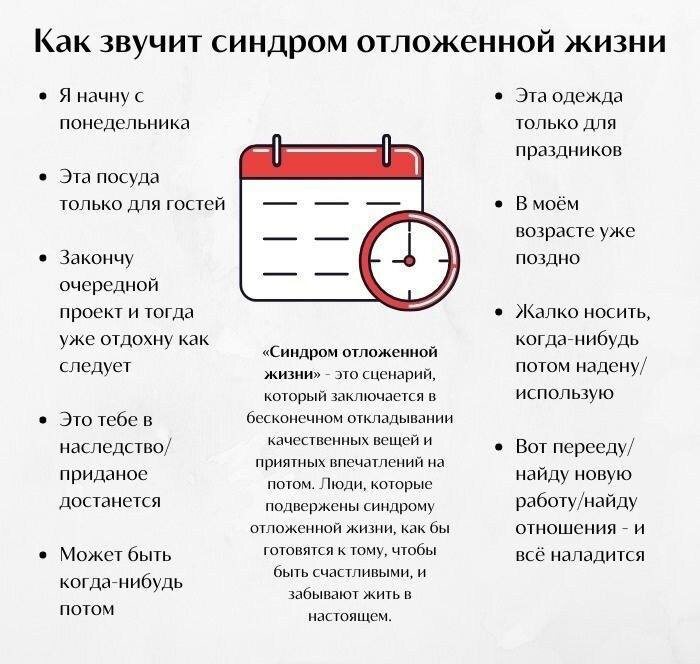 СИНДРОМ ОТЛОЖЕННОЙ ЖИЗНИ Синдром отложенной жизни – это психологическое явление, при котором человек живет с ощущением, что настоящая, полноценная жизнь начнется только в будущем, при выполнении определенных условий. Он постоянно откладывает счастье, удовольствие и важные события на потом, ожидая идеального момента, который часто так и не наступает. В основе синдрома лежит убеждение, что текущая жизнь «не та» и не является истинной. Настоящая жизнь, по мнению человека, начнется тогда, когда: – будет достигнута какая-то значимая цель (например, повышение на работе, покупка дома, получение степени) – будут устранены все проблемы и трудности – появятся определенные ресурсы (деньги, время, здоровье) – произойдет какое-то важное событие (свадьба, переезд, выход на пенсию). Человек живет в ожидании «идеального будущего», обесценивая настоящее и отказывая себе в радости и удовлетворении здесь и сейчас. В чем проявляется синдром отложенной жизни? 1. Постоянное ожидание: Главный признак. Ч