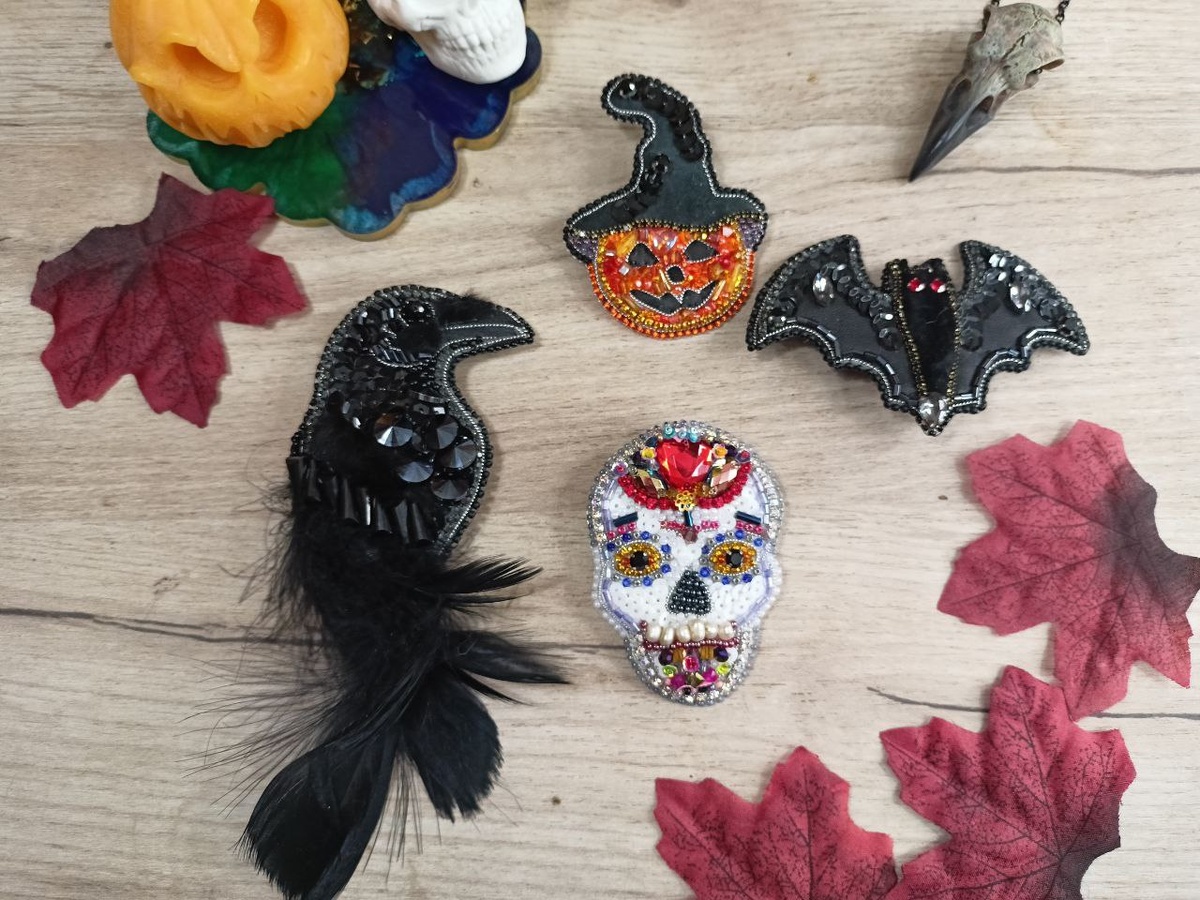 Пару недель назад я уже показывала вам осеннюю коллекцию украшений (из которой пока проданы только Мумми-тролль и кленовый листик), пообещав показать еще и то, что не готово, чуть позже. Время пришло - представляю вам украшения для конца осени - перехода колеса года от осени к зиме, окончанию сбора урожая, а именно это и символизирует Самайн, он же Хэллоуин. Один из самых древних праздников во всех культурах, в том числе и славянской, какое бы название этот день не носил. Есть, что отпраздновать - урожай собран, а впереди холодные и мрачные дни зимы - до самого Йоля, до 24 декабря дни будут все темнее и короче, а потому стоит закатить пир, порадовать себя подарками и украсить дом. Итак, украшения. Самый главный символ Хэллоуина - фонарь Джека, он же вырезанная горящая тыква. Поднимет настроение, убережет от злых духов, а еще станет отличным акцентом образа, дополнив объемный свитер. Брошь выполнена из стеклянных страз, чешского и японского бисера, стеклянных и хрустальных бусин, пайет