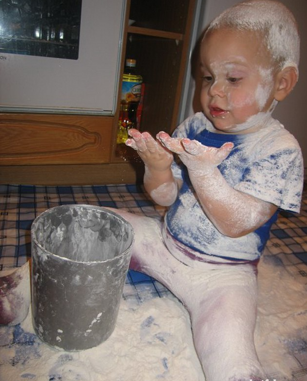 Малыш устроил на кухне снежную бурю из муки и сидит в эпицентре стихии — белый как первый снег и счастливый как первооткрыватель. Волосы под шапкой-пудрой, штаны — оттенка «мельничная классика», а на лице — то самое выражение: «Вот это да, оказывается, облака можно лепить руками!»