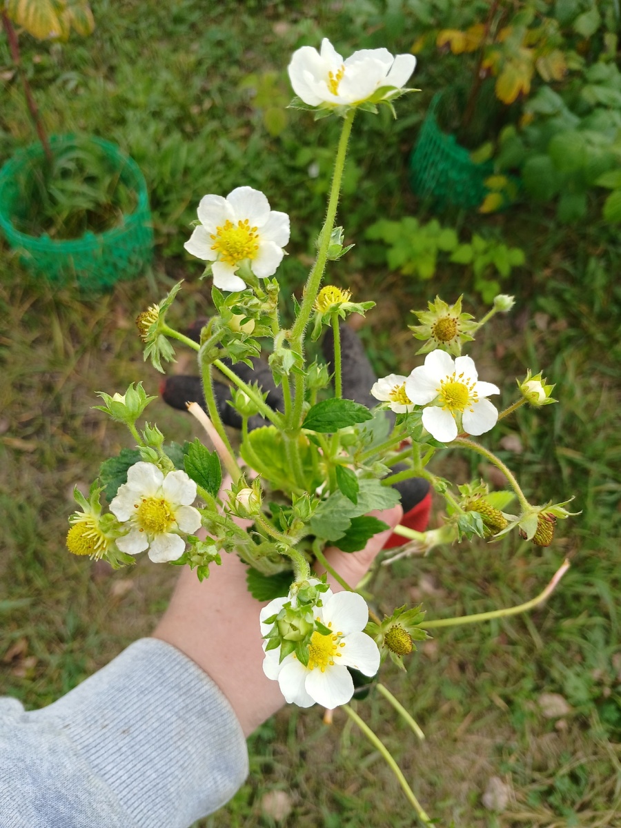 20 сентября на дворе, а земляника всё никак не уймётся. Прочитала, что такое бывает у неремонтантных сортов, если кустики получают хороший полив и подкормки, а также подкармливались бором в начале сезона. Ну и если погода способствует, конечно. То есть, мой случай по всем параметрам. Как бы то ни было, на это цветение растение тратит много сил, а завязавшиеся ягодки всё равно не успеют вызреть. Приходится снова удалять цветоносы, как и две недели назад. А вот малина - ремонтантная, тут всё по плану. И в список обязательных работ на следующий сезон нужно внести сооружение шпалер для малиновых кустов. А то ветки под тяжестью ягод до самой земли свисают.