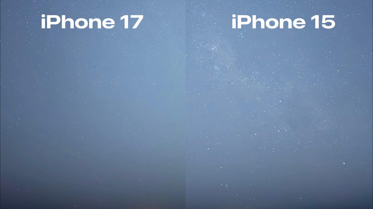 Сразу после релиза «яблочных» новинок на своём канале видеоблогер представил ролик со сравнительным анализом фотографий звёздного неба, полученных с помощью iPhone 17 и iPhone 15. На бумаге спецификации основной камеры у них совпадают (сенсор размером 1/1,56 дюйма и светосила f/1.6).