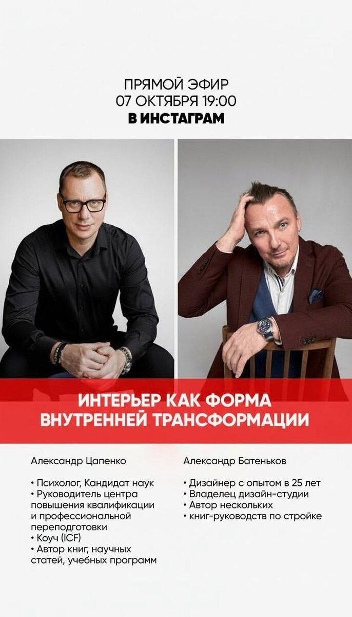 Ребятки, завтра я выхожу в эфир с @tsapenko_metod Поговорим о самом главном — о связи внутреннего мира и внешнего пространства 🔥 Этот эфир будет полезен: — Всем, кто планирует ремонт — чтобы понять свои истинные желания — Дизайнерам — чтобы лучше чувствовать клиентов и их потребности — Тем, кто интересуется психологией пространства Ждём завтра в 19:00 ❗️