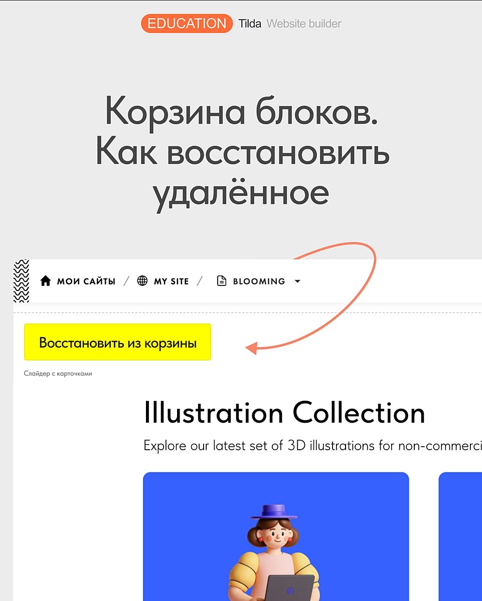 Куда пропадают удалённые блоки? В процессе создания сайта иногда случаются ошибки: кликнули на неверную иконку, изменили настройки не той страницы или даже что-то удалили. Рассказываем, что делать, если вы полностью сверстали блок и случайно удалили его. А если вам потребуется восстановить резервную копию сайта, вы можете обратиться в службу поддержки. Подробнее про восстановление читайте в Справочном центре 👉 https://help-ru.tilda.cc/site-backup