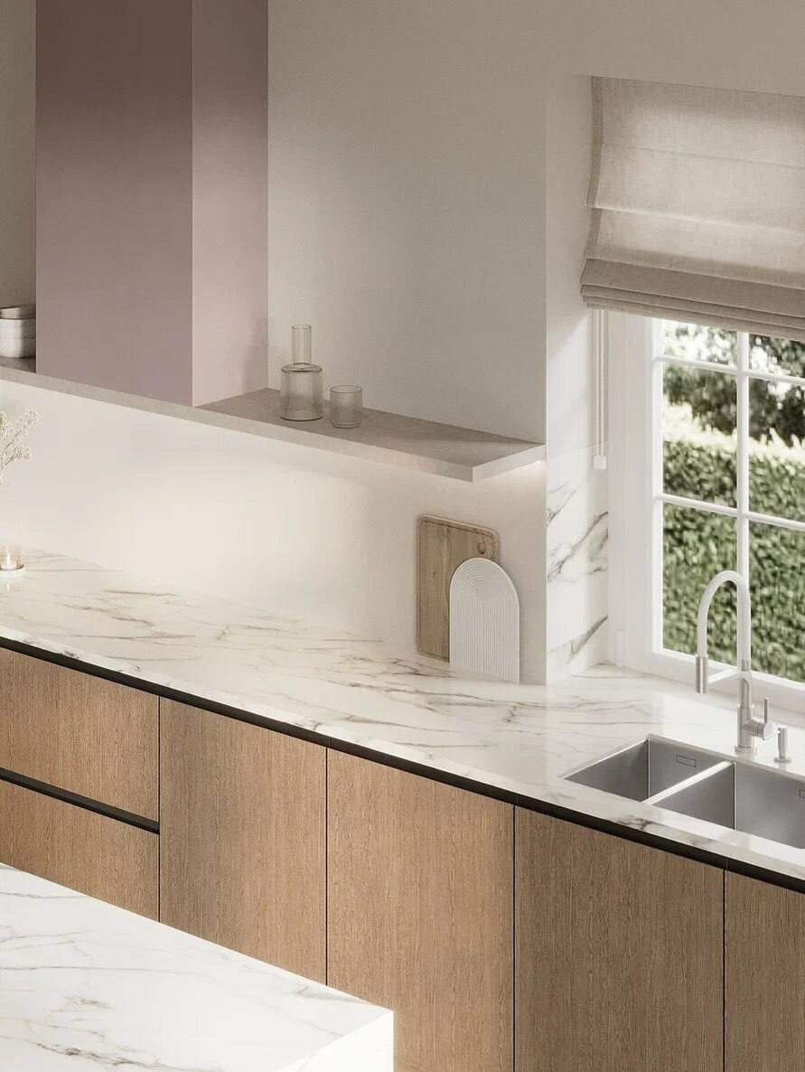 ▫️Цвета — нежная палитра: пыльная роза, тёплый оттенок дерева, светлые стены и мраморные поверхности. Всё мягко и гармонично, без резких контрастов.