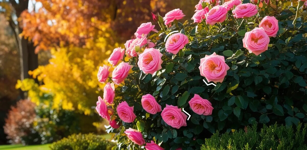 Осенью розы обычно обрезают: убирают невызревшие побеги, больные ветки и остатки цветков. Делать это лучше через неделю после последней подкормки. Тогда растение уже получило питание, укрепилось, и срезы быстрее затянутся.
