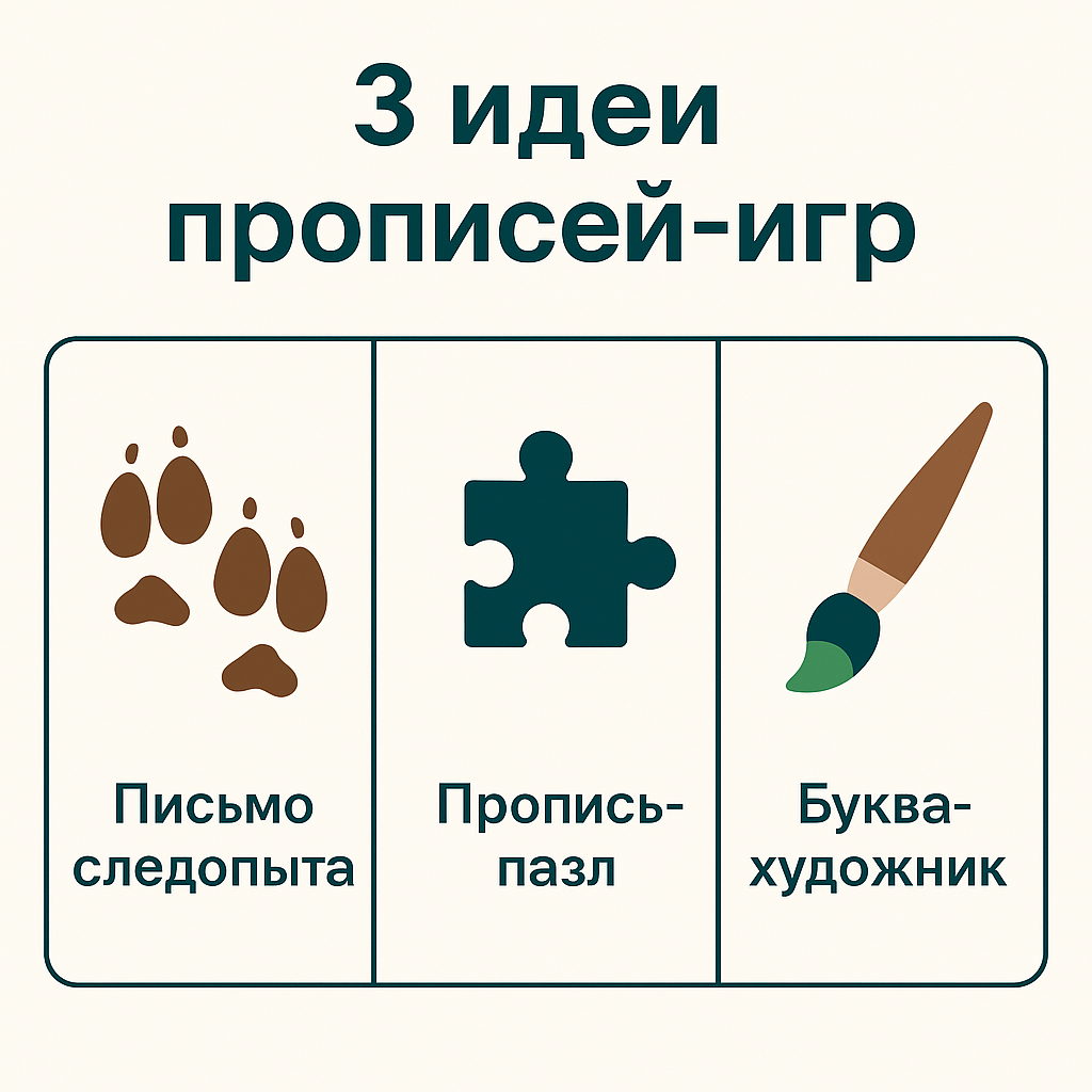 Многие дети не любят прописи — скучно, долго и «нельзя ошибаться». Но если превратить письмо в игру, всё меняется: рука тренируется, внимание растёт, а ребёнок с радостью садится за тетрадь. Почему игровые прописи работают: – ребёнок не боится ошибиться — это часть игры; – появляется интерес: каждое задание превращается в квест; – развивается не только почерк, но и внимание, память, логика. 3 примера прописей-игр: «Письмо следопыта» Нужно обвести следы животных — линии, петли, завитки. После этого появляется картинка. «Пропись-пазл» Каждая строка — часть рисунка. Когда все буквы написаны, открывается целая картинка. «Буква-художник» Дети украшают буквы узорами и цветом — тренируют руку и фантазию. Онлайн-занятия делают прописи интереснее: – педагог показывает задания на экране, а ребёнок пишет у себя; – за правильное выполнение ребёнок получает виртуальные «медали»; – можно менять уровень сложности — от простых линий до сложных букв. Вывод: прописи-игры помогают детям писать ак