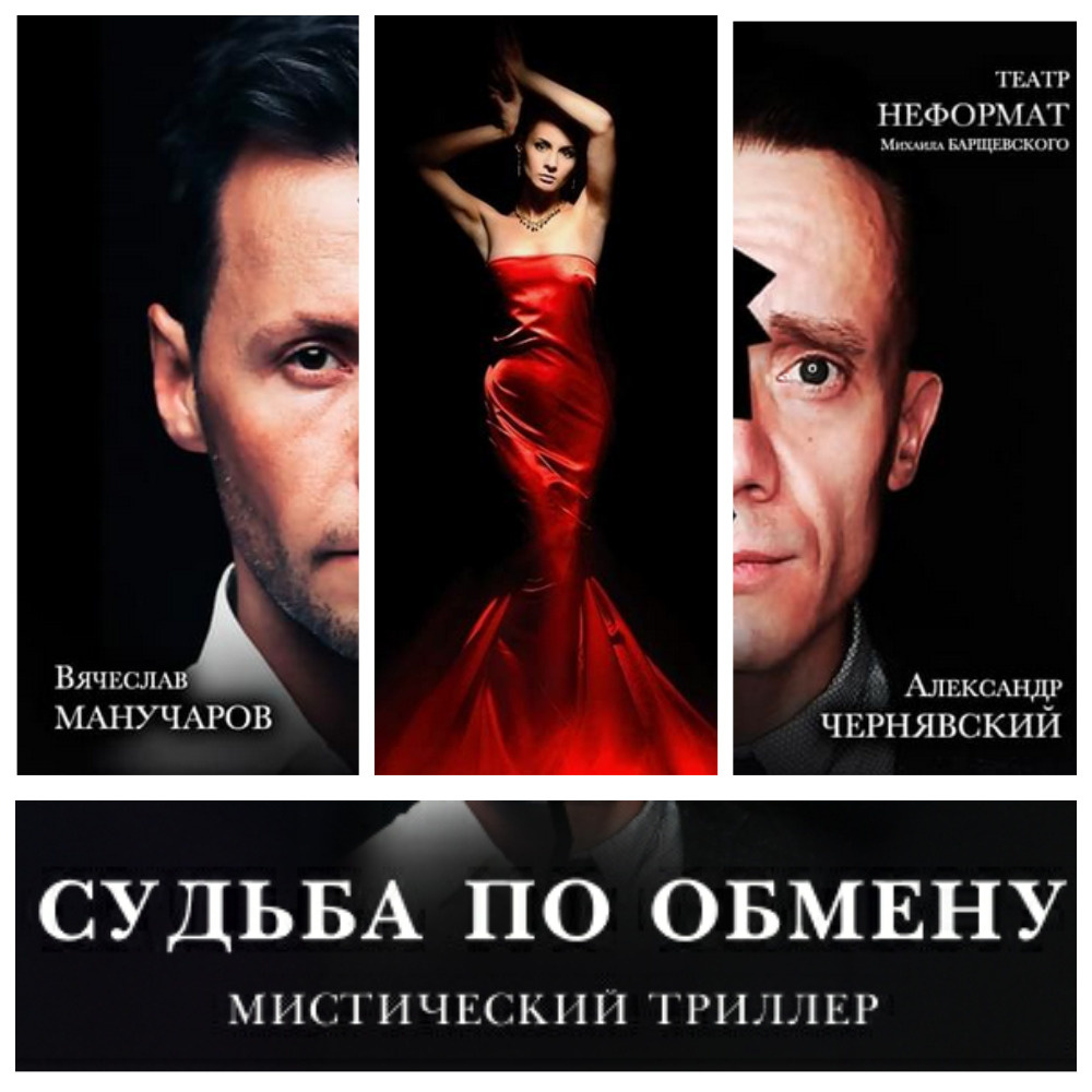 «Судьба по обмену» — это новый спектакль театра «Неформат» Михаила Барщевского. Авторы заявляют его в качестве триллера с элементами детектива и мистики. Ну если обратиться к Интернету, который знает все, то триллер – это произведение в кино. литературе или на сцене, которое должно вызывать у зрителей чувства тревожного ожидания, волнение и страх по поводу того, что же случится в следующей сцене. Мистика предполагает существование чего-то сверхъестественного, что должно усиливать эту тревожность, а детектив — свершение преступления и его расследование. В какой-то степени элементы всего этого есть в спектакле, но лишь элементы. Мистика — это обман, преступления — это финансовые мошенничества. Но так как все ясно, то расследование не требуется. И никаких тревог лично я не испытала, только любопытство.