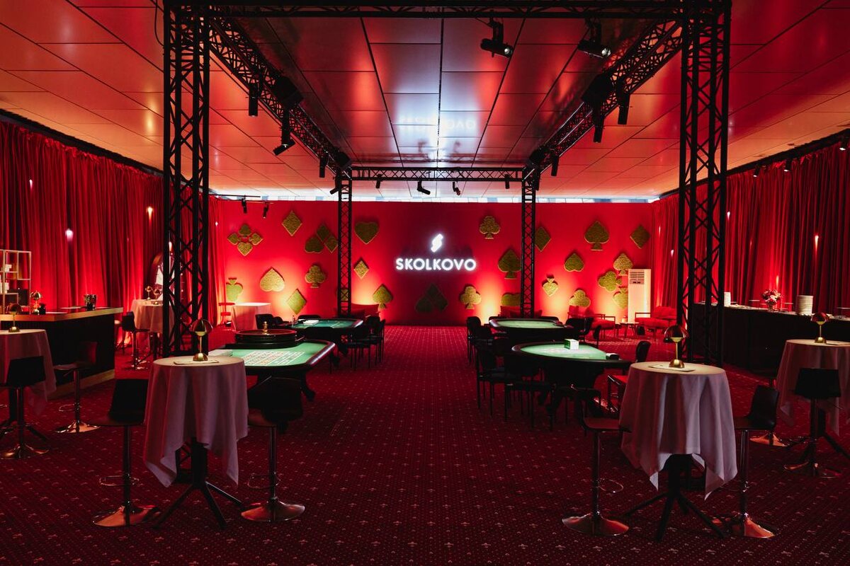 Общая концепция вечера - казино. И тут тоже не можем не поблагодарить гольф-клуб SKOLKOVO за сохранение традиций люкса. Есть заказчики, которые считают, что достаточно выполнить базовый минимум. А есть те, кто понимает главное: люкс он в деталях. Игровое сукно, колесо фортуны, фишки - все по спец.дизайну. Карты отрисованы специально для гольф-клуба Сколково, ковер в казино - трушный и недешевый. И колокольчик для получения welcome-бокала - с настоящим гольф-мячом.