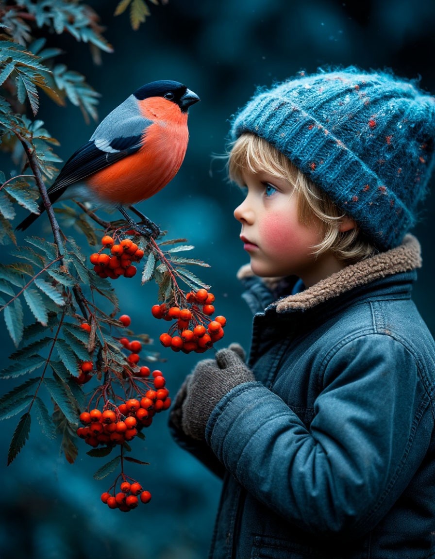 — Деда, а я их видел! — выдохнул он, и слова полетели белым паром. — Снегирей! Целую стаю! Прямо тут, на рябине! Красных-красных!