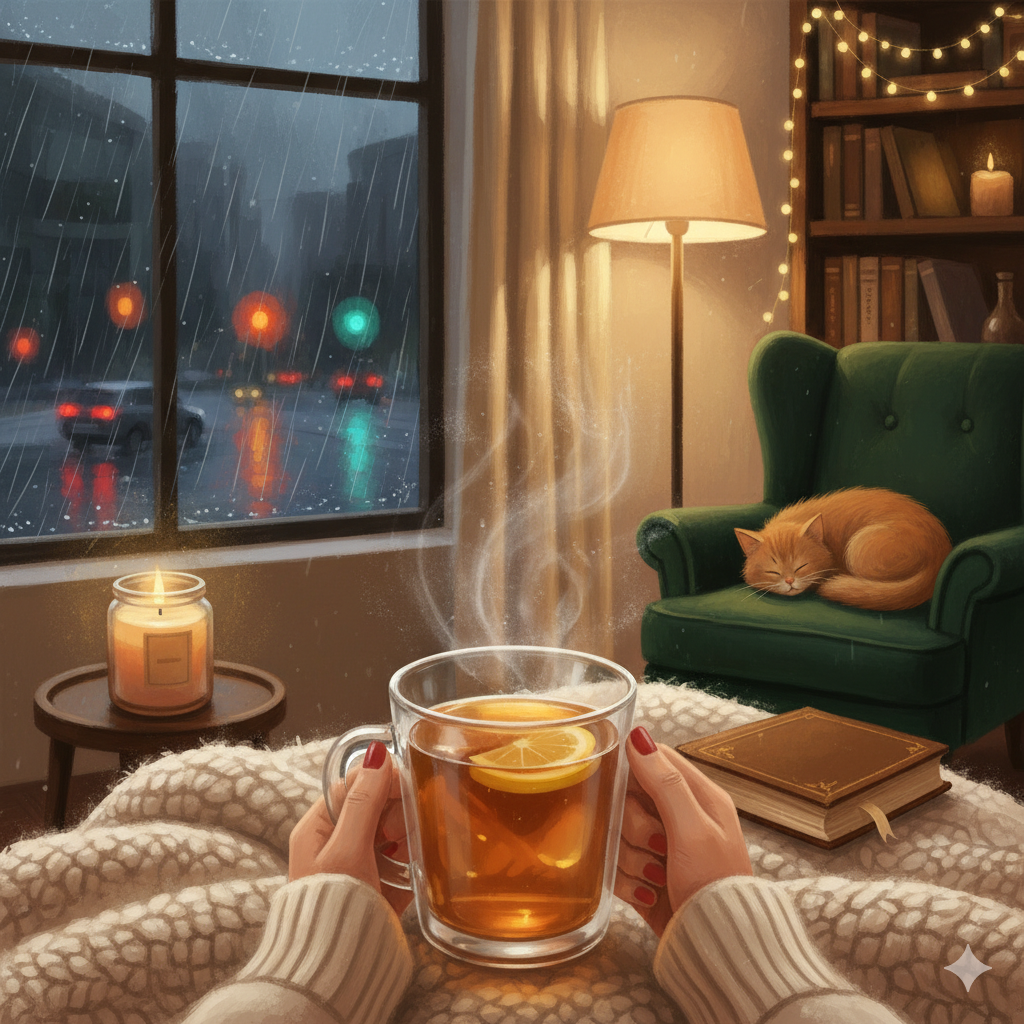 Стекло автобуса — холст, по которому размазан этот вечер. Осень наотмашь бьет холодным дождём, а из-за хмурых, свинцовых туч, словно нехотя, выглядывает одним глазом солнце. В воздухе витает недовольство. За окном мелькают силуэты: спешащие, сгорбленные под порывами ветра прохожие, зонты которых отчаянно борются со стихией, изгибаясь и становясь похожими на огромные шляпки сыроежек. Лужи, как разбитые зеркала, мерцают под ногами, а размытые отражения светофоров кажутся фантастическими, нереально яркими пятнами в этой монохромной картине. Моя остановка. Из тёплого нутра автобуса я выползаю в «хохочущий» мокрый холод. Я почти бегу, не замечая красоты тополиных листьев, подсвеченных огнями фонарей. Каждый шаг отзывается неприятным хлюпаньем — мои любимые туфли промокли насквозь. Невольно морщусь от холода и сырости, все мысли только об одном: скорее бы дойти и встать под горячий душ. И вот оно, спасение: моя дверь. Скорее провернуть ключ в замке, сбросить мокрую одежду, завернуться в мяг