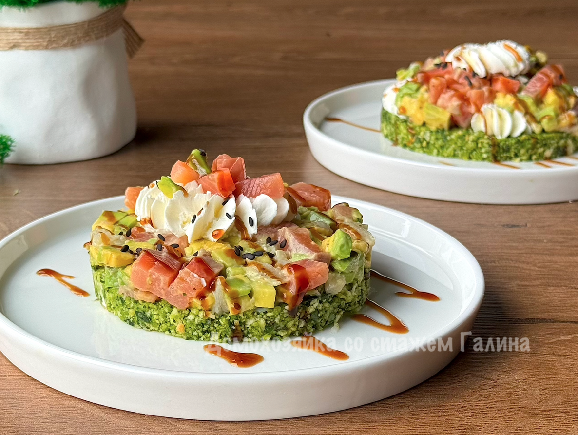 Попался мне очень интересный рецепт и сразу же зацепил необычной подачей. В оригинале всё выглядело как большой закусочный чизкейк на общем блюде: творожный сыр, красная икра, немного зелени. Я не удержалась и решила приготовить, но немного по-своему: сделала порционно и назвала это «закусочный тарт». Во вкусе сомнений не было ни секунды. Я давно знаю, что сочетание творожного сыра, крекеров и красной рыбы беспроигрышное. А тут ещё и стильная подача! Конечно же, не могу не поделиться с вами, а вдруг идея вам понравится и вы захотите повторить её на своём праздничном столе! Авокадо разрезала вдоль, удалила косточку и аккуратно вынула мякоть. Нарезала её небольшими кубиками, переложила в миску и сразу сбрызнула лимонным соком, он добавит лёгкую кислинку и не даст авокадо потемнеть. Затем нарезала мелкими кусочками слабосолёную красную рыбу и холодного копчения палтус, отправила к авокадо. Заправила всё кунжутным соусом. Хорошо перемешала. Для основы в чашу измельчителя выложила свежий шп