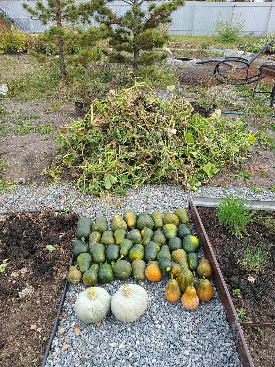 Вот что могут выдать 7 семян. Одно было от тыквы Грибовской зимней, остальные шесть - тыква Капелька. Грибовские выросли скромные, зато Капельки в большинстве своём получились крупнее ожидаемых 500 гр. Жутко плетистая тыква, прищипывала я её сильно и не раз, цвела и завязывала плоды она вплоть до сегодняшнего дня. Погода не шепчет, Капельки только начали дозревать, но это не страшно - дозреют дома. Мы уже снимали парочку и даже делали тыквенные лепешки с сыром. Тыква вкусная, десертная, мякоть плотная, семян мало, а грушевидная форма позволяет запекать в ней что-нибудь, как в горшочках. Грибовская же неспроста зимняя - хранится она хорошо и набирает вкусовые качества в процессе хранения. А ведь мы ещё кабачки не доели...