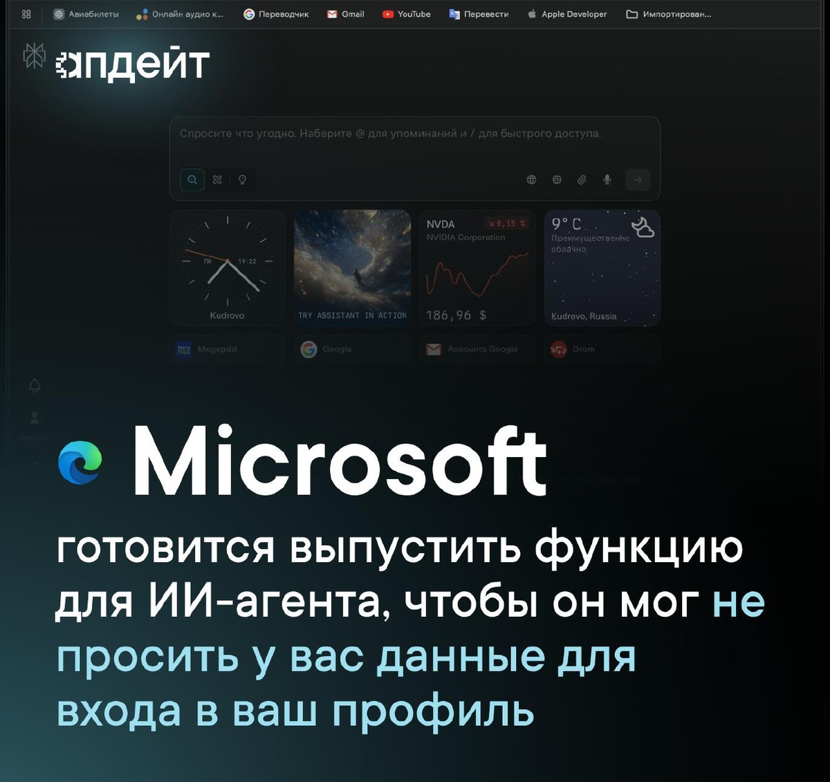 ⚡️Microsoft Edge получит еще больше ИИ-функций У Microsoft есть ИИ-агент Copilot Actions, который может выполнять поиск информации за пользователя, однако когда нужно ввести пароль или другую персональную информацию, ИИ просит пользователя ввести данные. И, предположительно, будет настройка, с помощью которой ИИ больше не будет вас просить об этом. Copilot также может попросить вас о предоставлении доступа к истории поиска за последние 7 дней. Это нужно для того, чтобы при создании новой вкладки на стартовой странице, пользователю предлагались персонализированные карточки, основанные на его часто используемых сайтах. Такое уже есть в браузере Comet от Perplexity. Однако функция Journeys платная — доступна в Copilot Pro за $20 (~1637 рублей). ⚡️ Подписаться.