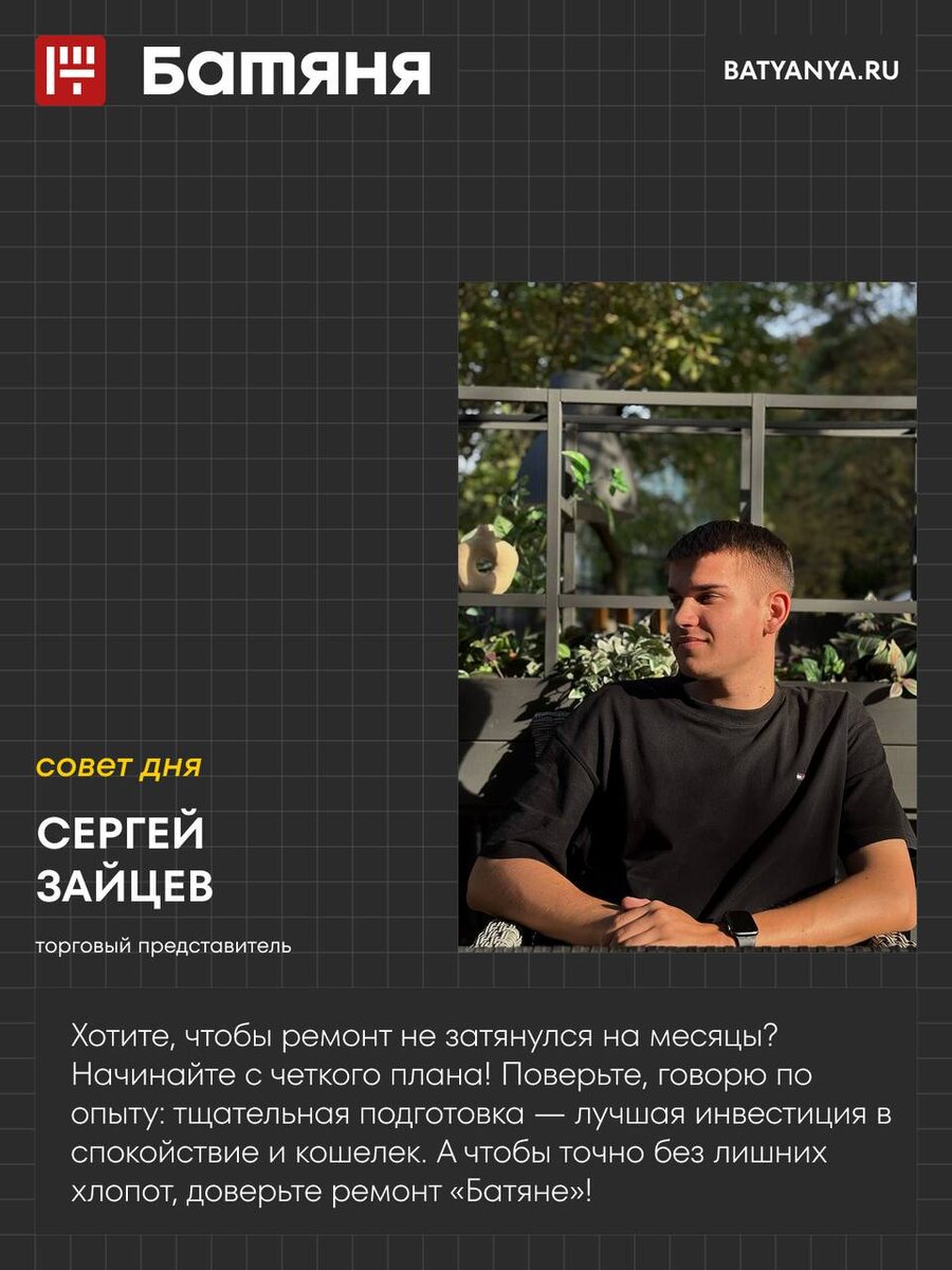 🪚 РЕМОНТ: ПРАКТИЧНЫЙ ПОДХОД Сергей Зайцев — наш торговый представитель, знает как сделать ремонт эффективным: «Мечтаете о ремонте, который не выйдет из-под контроля? Начните с детального плана! Личный опыт подсказывает: тщательная подготовка — гарантия качественного результата и экономии. А чтобы реализовать все задумки без проблем — доверьте это Батяне!»