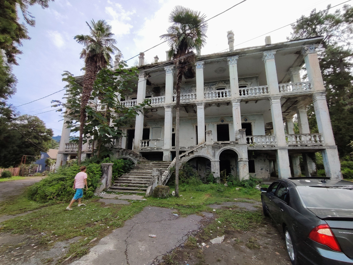 Любили питерские аристократы дачи на черноморском побережье. Только, почему-то, строили в субтропиках что-то похожее на свои северные дворцы. Нет что-то вроде итальянского палаццо построить. С широкими открытыми террасами. Подходящими климату. Такое, как, например, дача Суворина. Которую он под Туапсе построил. Или как, например, дворец в Махинджаури. Рядом с Батуми. Везде называют хозяйкой этого дома графиню Марию Фесенко. Мол, графиня была воспитательницей будущего последнего российского императора Николая II. Вот благодарный воспитанник и построил ей этот дворец. В начале прошлого века. Дворец двухэтажный. Или даже трех. Если цокольный этаж считать. Главная фишка- широкие балконы лоджии по периметру всего здания. И на первом этаже. И на втором. Все пока выглядит довольно прилично. Хотя потолок уже обваливается. Лепнина давно обвалилась. Внутри давно уже ничто не намекает на графские покои. Во дворце после революции детский дом был. А в начале 90-х – беженцев разместили. Куда детдом