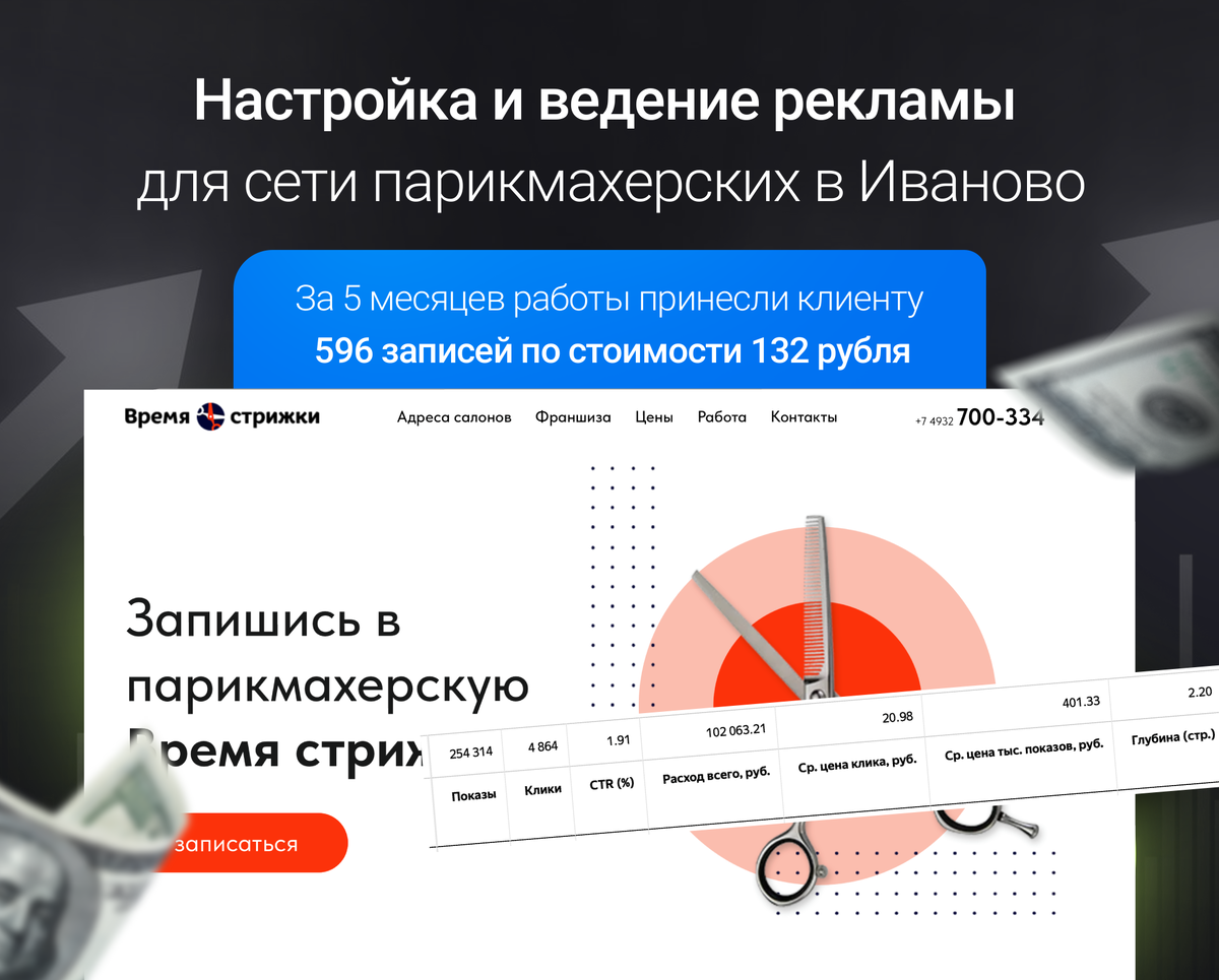 Ко мне обратилась сеть парикмахерских бюджетного сегмента из Иваново с задачей запустить эффективную контекстную рекламу в Яндекс Директ и стабильно привлекать новых клиентов в условиях ограниченного бюджета. Главной целью было получение максимального количества записей на стрижку стоимостью 400 рублей с минимальной стоимостью лида.