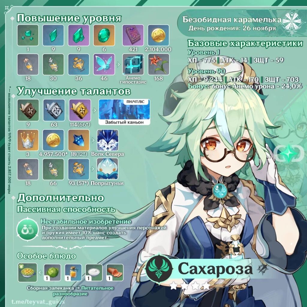 ㅤСахарозе требуются лишь мастерство стихий и восстановление энергии, тем более, что при прокачке она повышает Анемо урон. Поэтому нужно рассматривать оружия на эти показатели.