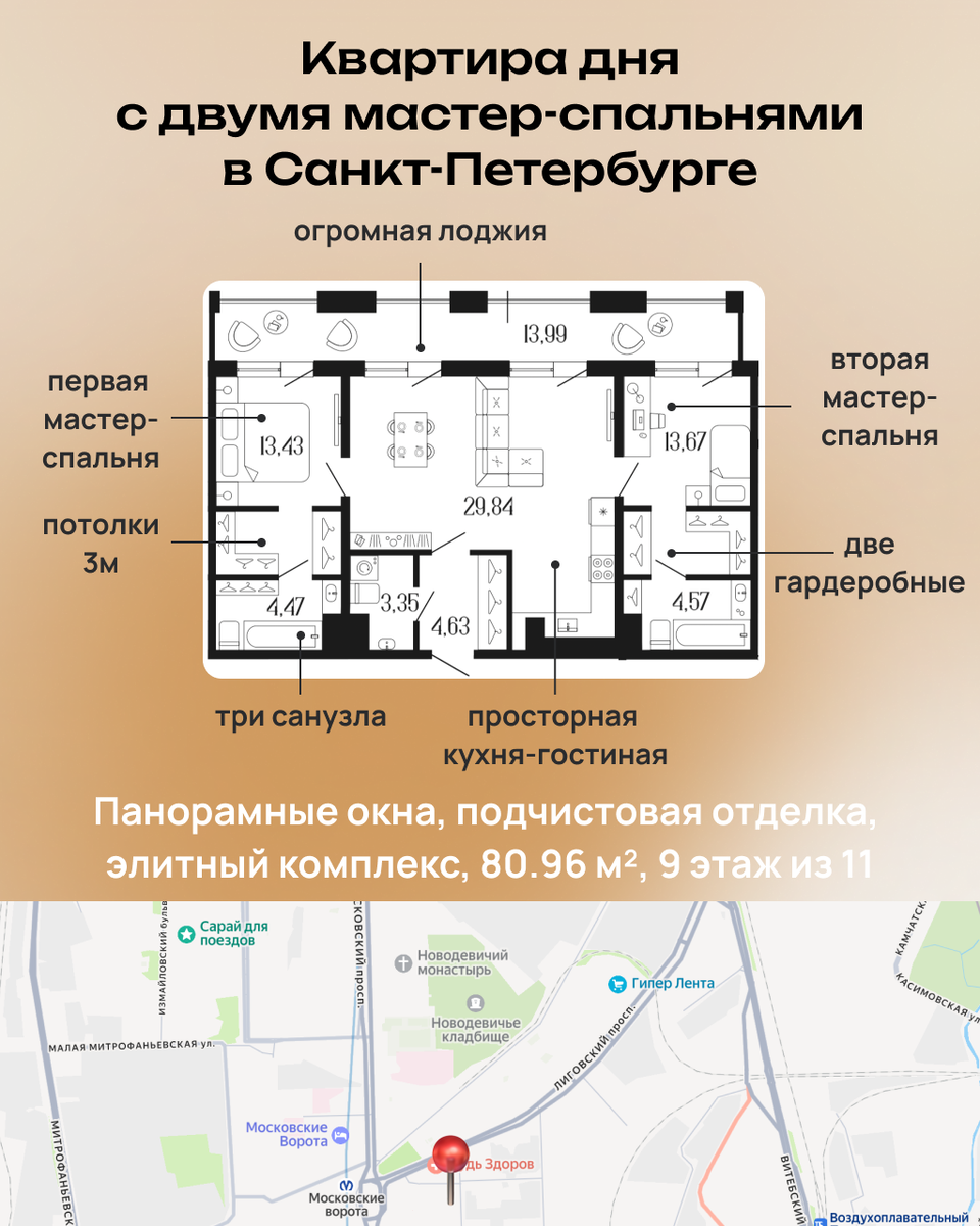 Скидка 8 400 000 ₽ на квартиру дня в Московском районе Это не планировка для семьи, а песня. Две мастер-спальни, каждая со своей гардеробной и санузлом. Между ними просторная кухня-гостиная, где удобно собираться всей семьёй, но при этом у каждого остаётся личное пространство. Такое решение идеальный вариант для любителей тишины и комфорта: никто не мешает утреннему сну или рабочему созвону При входе распологаются зона для хранения и гостевой санузел. Выделенная зона готовки для ценителей порядка и функциональности. А лоджия… 😍 14 м² во всю длину квартиры и целых четыре выхода. Когда мы это увидели, сомнений, что именно она станет квартирой дня, не осталось 🔑 Ключи уже в конце года, подчистовая отделка, никаких пыльных работ. В продаже осталось всего 13 квартир, среди которых: Не упустите шанс забрать эту красотку со скидкой 8,4 млн🙌🏻 Заполняйте форму https://mrqz.me/ohdl, расскажем подробнее о жк и поможем забронировать