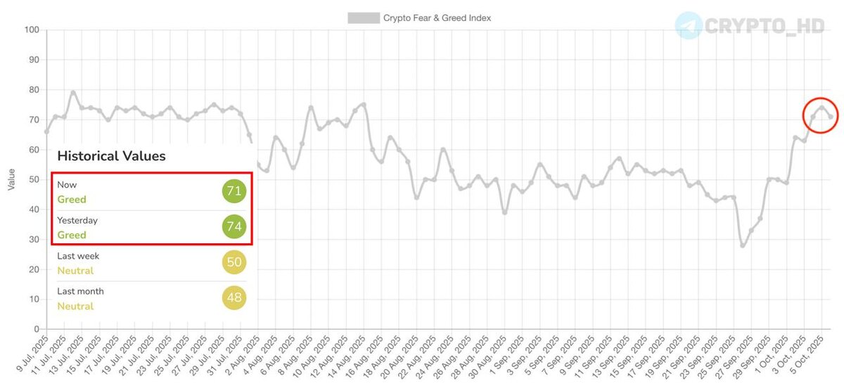 🐃 Индекс страха и жадности сейчас на максимальных с августа значениях – 71-74 (Жадность).