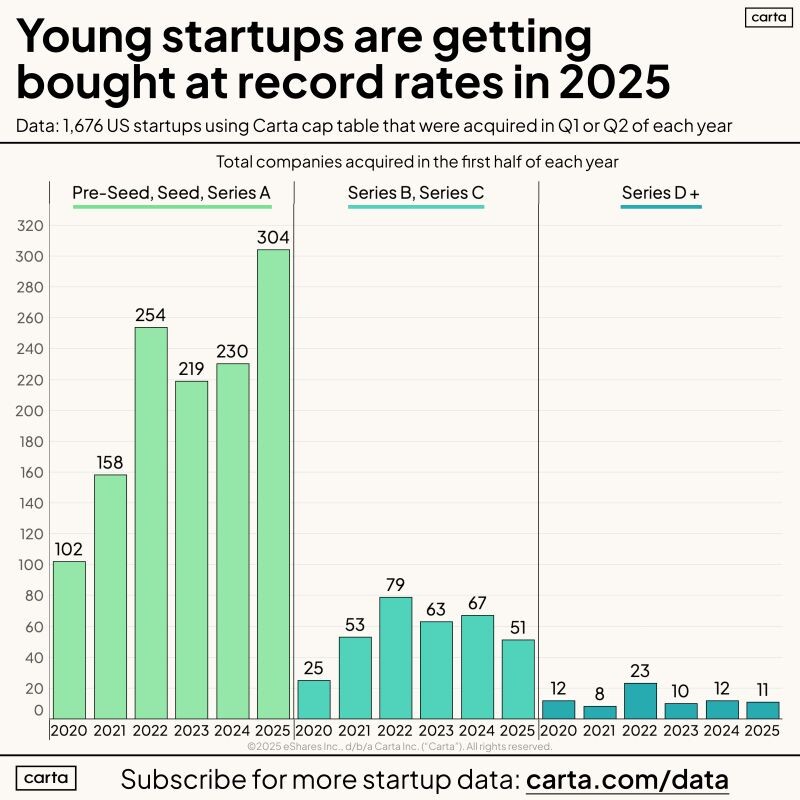 Young startups are snatching up deals at record speed! 🚀 In the first half of 2025, M&A transactions among Carta companies jumped by 18%. And guess what? The real action is in the early stages: Pre-Seed, Seed, and Series A saw a whopping +30% year-over-year growth! 📈 Who's buying? The usual suspects—Big Tech, private equity funds, and the startups themselves. Why are they eyeing such fresh faces? The main reason: AI-native products and teams. For big players, it's a swift way to integrate expertise and supercharge their transformation. ⚡️ And here's the kicker—these deals often end up being more beneficial for founders and employees! Most early-stage teams dodged those "toxic" valuations from the 2021 bubble that made selling a headache. 💼✨