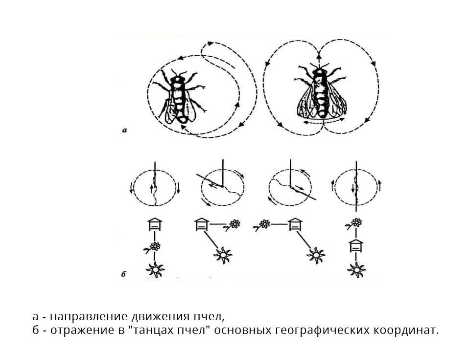 - Направление:Направление виляния пчелы по отношению к вертикали улья указывает направление полета к источнику относительно солнца. Движение вверх – к солнцу, вниз – от солнца.
