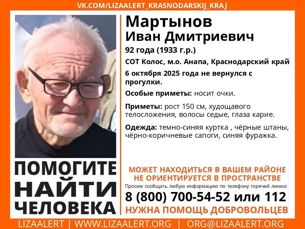 Внимание! #Пропал человек! Пропал #Мартынов Иван Дмитриевич, 92 год (1933 г.р.), СОТ #Колос, #Анапский район, Краснодарский край С 06 октября 2025 года его местонахождение неизвестно. Приметы: рост 150 см, худощавого телосложения, волосы седые, глаза карие. Одет: тёмно-синяя куртка, черные штаны, чёрно-коричневые сапоги, синяя фуражка. НУЖДАЕТСЯ В МЕДИЦИНСКОЙ ПОМОЩИ ___ Инфорг поиска: Юлия 89950037206 Горячая линия отряда: 8 800 700 5452 (звонок бесплатный) 🤩 Подписаться | БОТ ННН