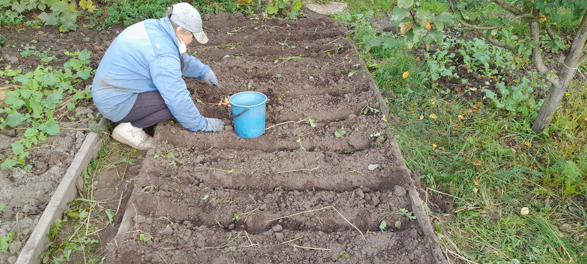 Кладу зубчики в дырочки, беря их за острый кончик и сразу же засыпаю землёй, делаю холмики. Затем закрываю той же перепревшей травой, что была на грядке и еще добавляю опавшую листву, ветки от ежевики, малины, чтобы листва не улетела от ветра, а чесноку зимой будет тепло под такой шубой (а весной не забудьте всё это убрать). Обычно я сажаю чеснок с пятого по десятое октября, лучше перед дождем, а не после дождя.