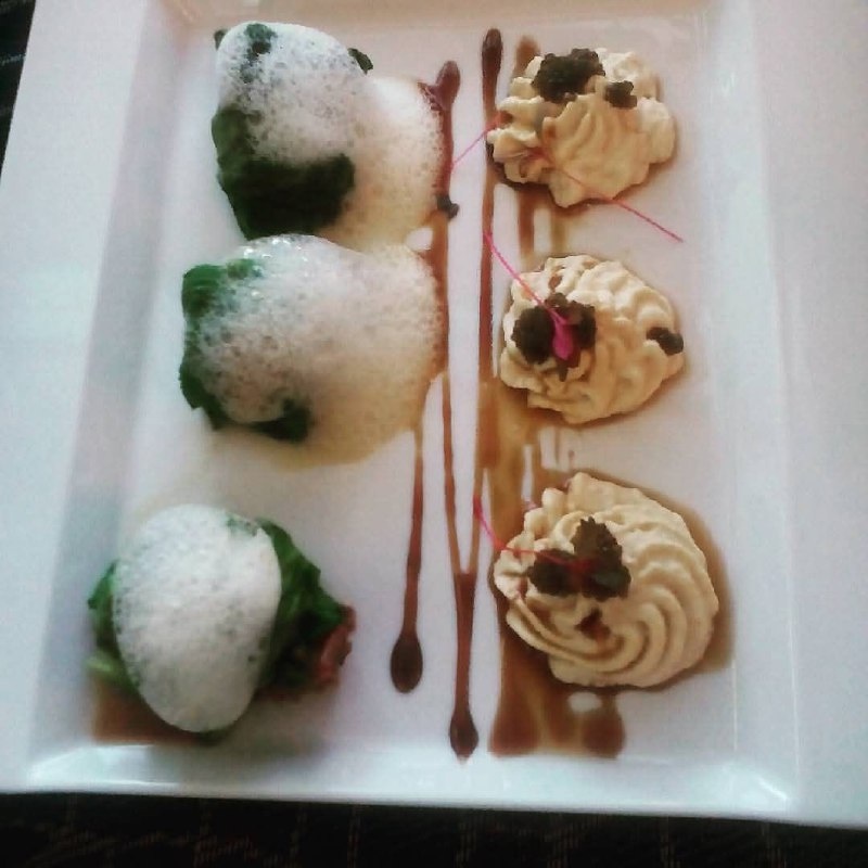 Телячьи щеки... А- А-А-Язык проглотить))) со сливочным пюре из капусты, мятной икрой и пеной из хрена и ростки амаранта! Ну очень вкусно. В кафе "Гурме Галерея". До создания зимней коллекции блюд, они будут в меню!