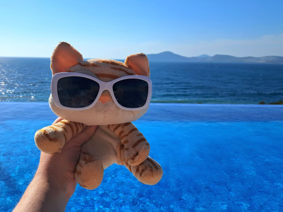 Отель находится чуть на горе (невысокой), за счёт этого и обеспечиваются офигенные виды из любой его точки, прекрасные закаты, и достигается нужный эффект инфинити-бассейна, — но это и значит, что к пляжу нужно чуть-чуть спуститься. Немного. Для сравнения, когда в 2021 году я была в греческом Афитосе, там подъем был гора-а-аздо выше! Насчёт моря и купания в нём хозяин нас сразу предупредил: до полудня, мол, плавайте сколько угодно, а вот во второй половине дня — аккуратнее, сильные волны. Мы в первый день (приехали после 15:00) рискнули попробовать, но тут же убедились в его правоте.:( Увы. Зато утром — благодать, море спокойное-спокойное, чистое. Сам по себе пляж, правда, никакой — буквально полдюжины шезлонгов плюс понтон (можно спуститься в море с лесенки). Мне другого и не надо. Но кому-то, уверена, может не понравиться (и не без причин). Тем более, что и заход в море неидеален — камни.